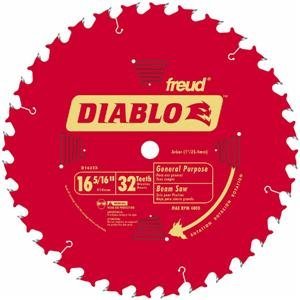 Freud D1632X 16-5/6" 32T Diablo General Purpose Beam Saw BladeAn excellent choice for table & miter saws, this blade leaves a smooth cut in a variety of applications, reducing the need to change blades between tasks. Use it for rip cuts with a smoother finish than dedicated ripping blades, or make quality crosscuts in solid wood or plywood. Great for both sliding and ?Ç£chop?Ç¥ style miter saws as well as table saws.Freud D1632X 16-5/6" 32T Diablo General Purpose Beam Saw Blade Features:; Laser cut bodies for accurate cuts; Freud micrograin carbide for long life; Anti-vibration vents for stability; Perma-shield coating to resist heat; Thin kerf design to increase machine performance; Beam saw blade ; Great for general purpose work ; Perms-SHIELD non-stick coating ; Laser cut heat expansion slots ; Tri-metal shock resistant brazing ; TiCo Hi-density Carbide blade ; 4,000 maximum RPM ; 1" arbor ; 32 teeth ; 16-5/6" blade diameter ; Carded